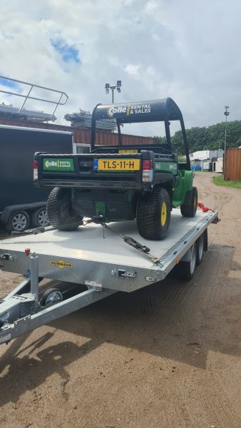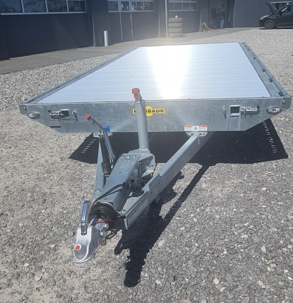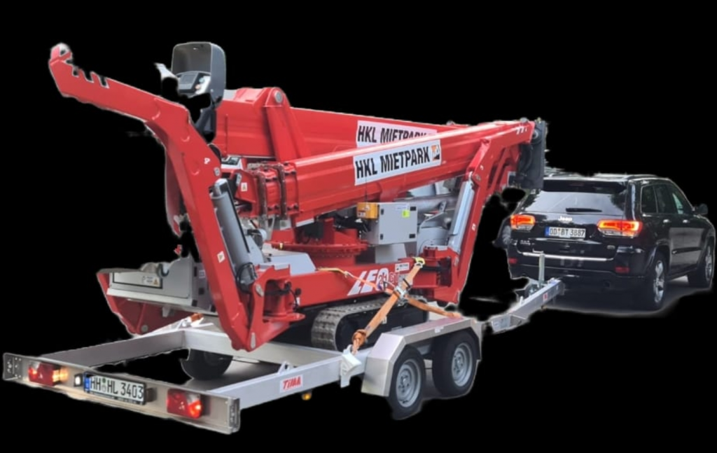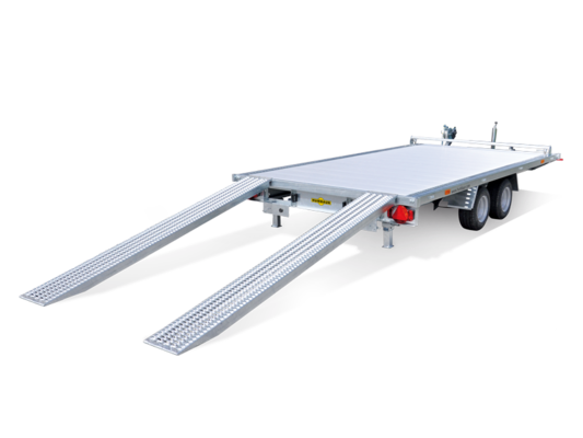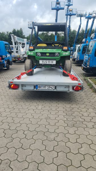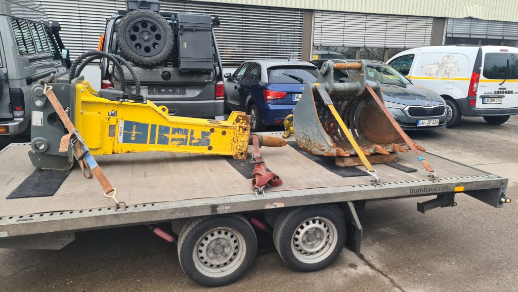 Wir transportieren mit einem HUMBAUR Anhänger mit Rampen 3500 Universal, 100 km/h Zulassung, um auch Fahrzeuge, Baumaschinen, Minibagger, sowie selbstfahrende Arbeitsbühnen zu transportieren.
