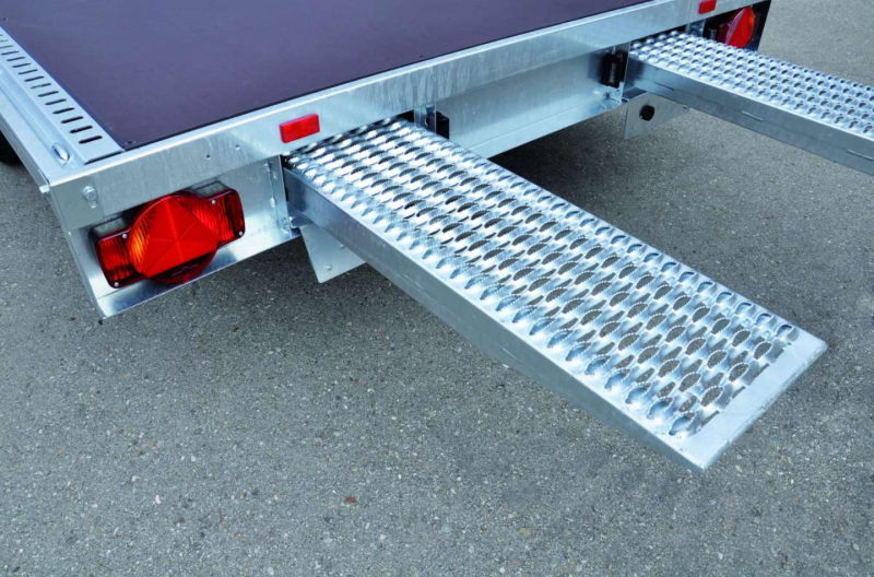 Der Anhänger hat Auffahr Rampen, für selbstfahrende Fahrzeuge.HUMBAUR 3500 Universal Anhänger Bj.2024 mit 100 km/h Zulassung.JEEP Grand Cherokee Overland ‑Walnuß braunJeep mit Anhänger für Autotransporte bis max. 3to.